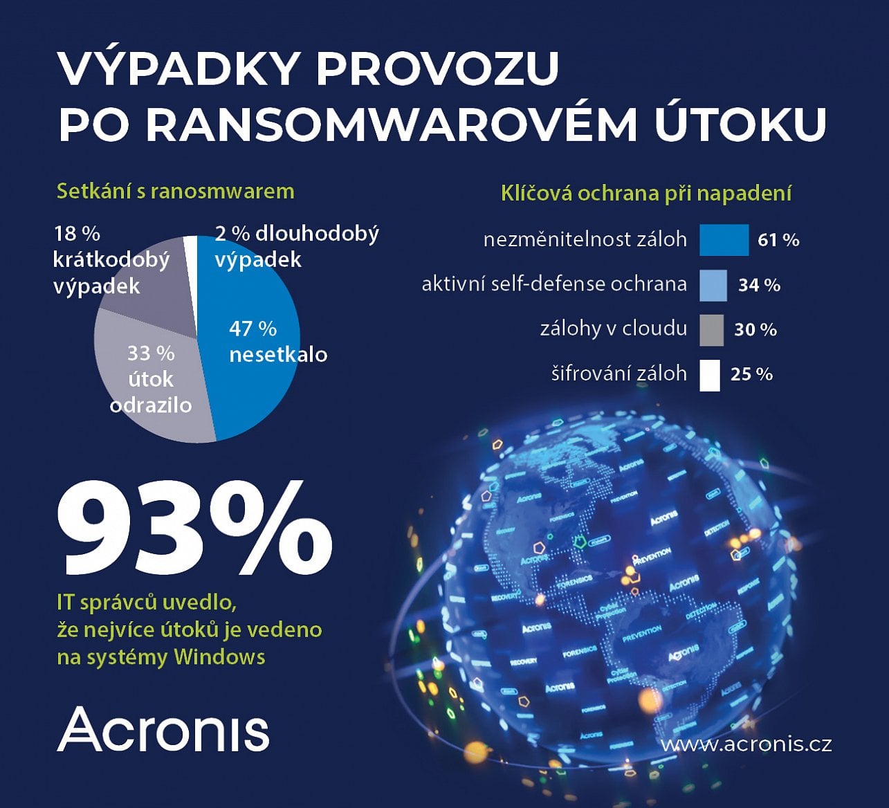 Společnost Acronis představila výsledky průzkumu, podle kterých 20 % českých organizací zažilo během posledních 12 měsíců výpadek provozu v důsledku ransomwarového útoku.