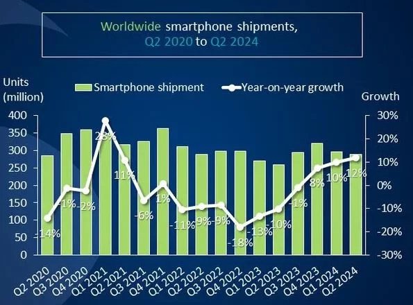 Společnost Canalys ve své nejnovější zprávě informuje, že globální trh chytrých telefonů ve druhém kvartálu 2024 opět povzbudivě rostl. V období od dubna do června vzrostly dodávky o 12 % na 288,9 milionu kusů, což je třetí po sobě jdoucí čtvrtletní zlepšení.
