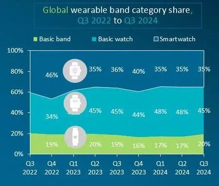Segment základních náramků se poprvé od třetího kvartálu 2020 vrátil k růstu a oproti stejnému období roku 2023 vzrostl o 7 % s 10,4 milionu dodaných kusů. Pozitivnímu zvratu pomohlo zejména nedávné uvedení náramku Mi Band 9 od Xiaomi a Galaxy Fit3 od Samsungu.