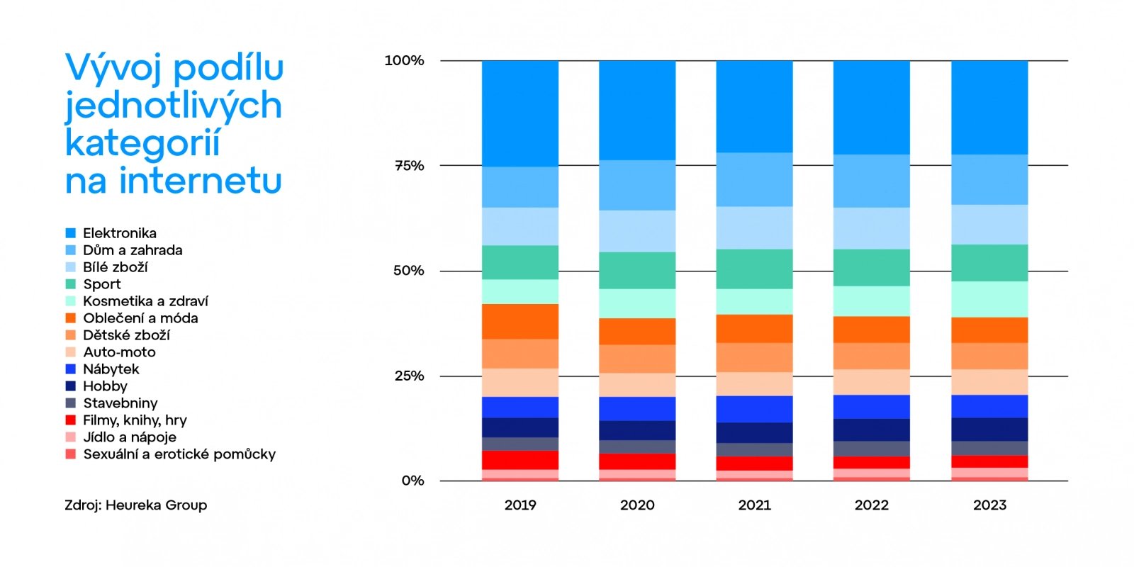 Nejsilnější je podle Heureky elektronika, která však v řádu let postupně ustupuje – od roku 2019, kdy měla 25 % je aktuálně na 22 %. Naopak postupně roste sekce kosmetiky a zdraví z 6 % v roce 2019 na aktuálních 8 %.