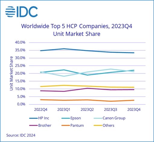 Dodávky klesaly všem největším výrobcům, vítězem mezi poraženými je Brother, jenž ve čtvrtém kvartálu oslabil o 7,5 %. Lídr trhu HP zaznamenal propad o 18,8 %, druhý Epson o desetinu, třetí Canon oslabil o 15,3 %. Nejhorší výsledek si připsal pátý Pantum, jehož dodávky vykázaly sešup o 25,7 %.