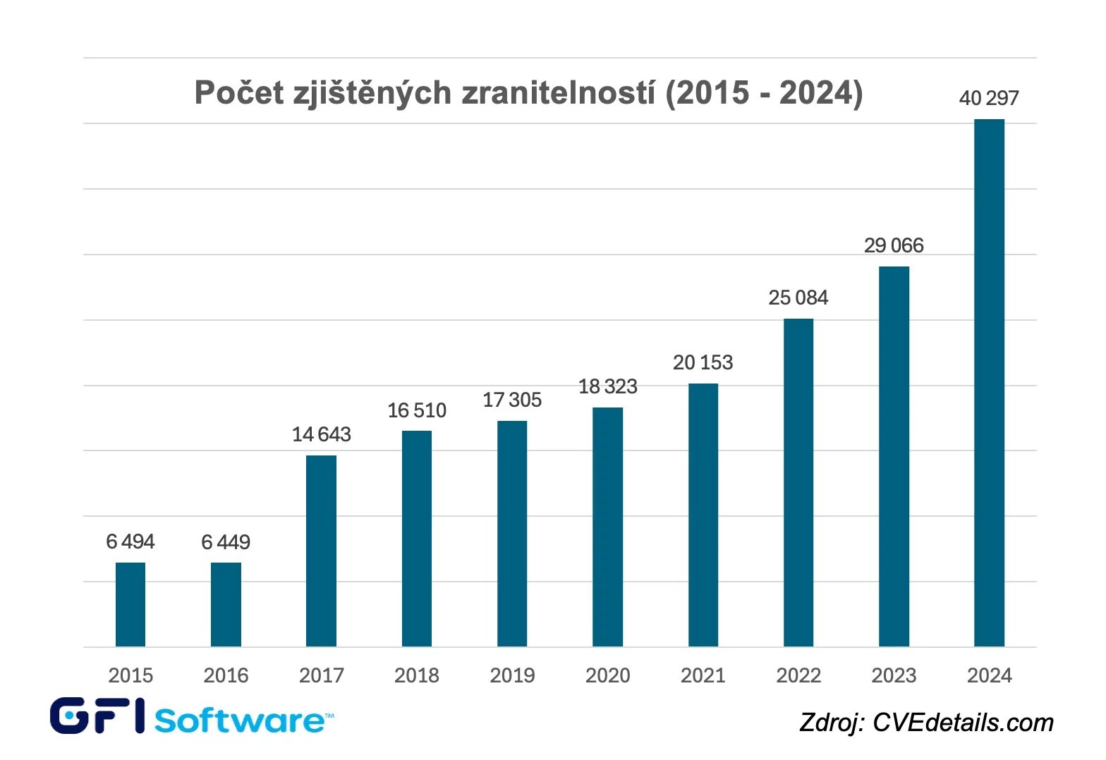 Společnost GFI Software na základě aktuálních údajů z katalogu zjištěných zranitelností CVE bylo v loňském roce zjištěno rekordních 40 297 zranitelností, tedy o 39 % více než v roce 2023. K výrobcům s největším počtem zranitelností se vloni zařadili Linux, Microsoft, Google, Adobe a Apple, nejohroženějším softwarem zůstávají operační systémy.