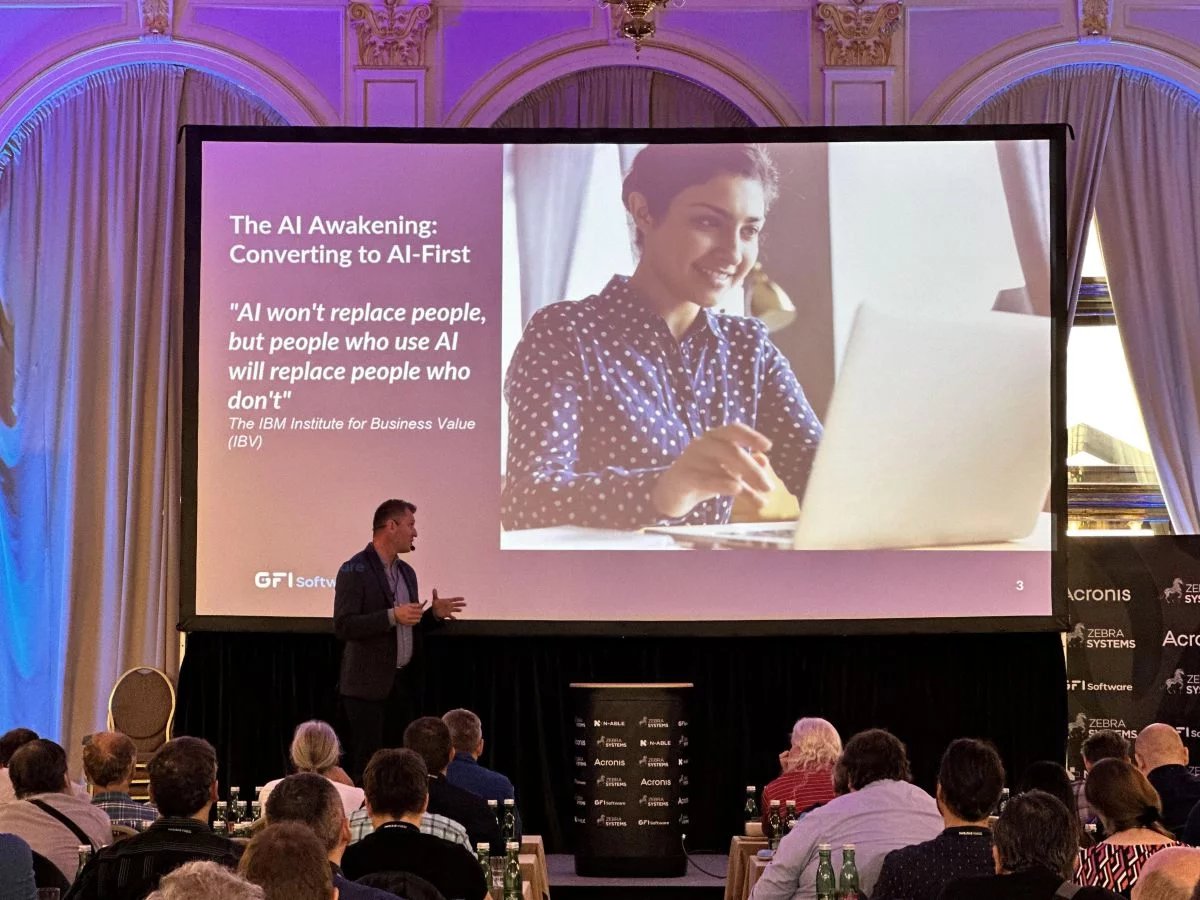 Po dynamickém a humorném úvodu přišel čas se bavit o byznysu. První odborné přednášky se chopil Jozef Kačala, VP of sales engineering pro značku GFI Software, jenž hned v úvodu prozradil, že GFI bere osvětu a zejména reálnou aplikaci umělé inteligence velmi vážně.