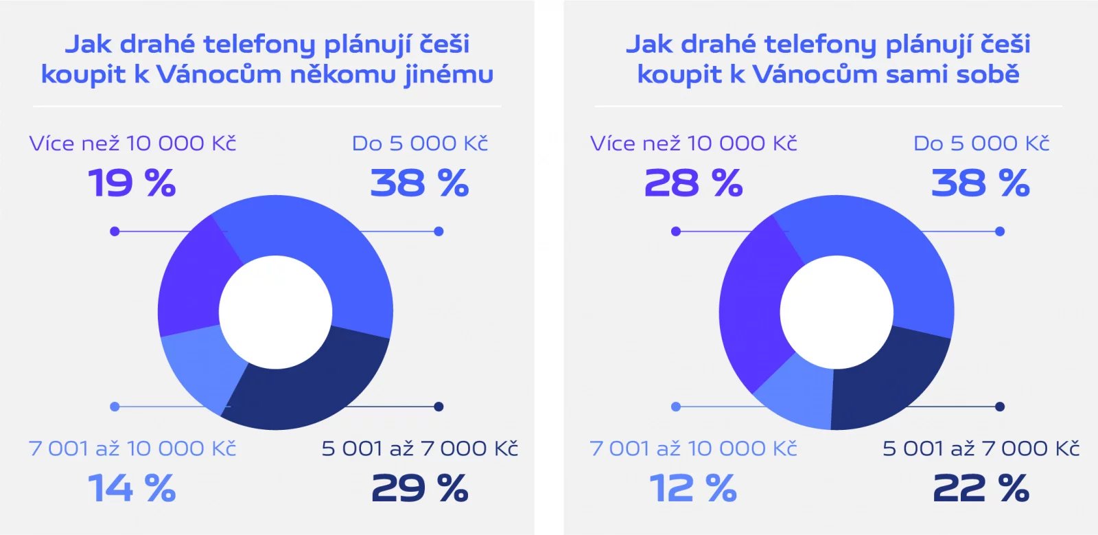 Průzkum dále odhalil, že Češi jsou sami sobě ochotnější kupovat dražší telefony. Hned 28 % telefonů „do vlastní ruky“ bude těch z nejvyšší cenové kategorie nad deset tisíc korun. U telefonů pro ostatní tvoří tato kategorie jen 19 % celkového výběru.