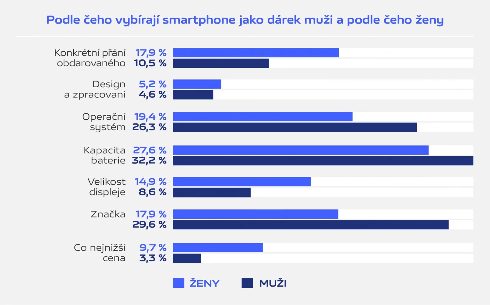Muže také o něco více zajímá použitý operační systém nebo kapacita baterie. Ženy zase velikost displeje a častěji se řídí podle toho, jaký konkrétní telefon obdarovaný chce.